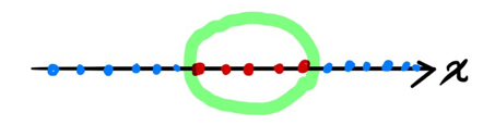 예를 들어, 다음과 같은 선으로 이루어져 있는 비선형 특징을 가지는 1차원 데이터는 선형으로 분류하기 힘들다.