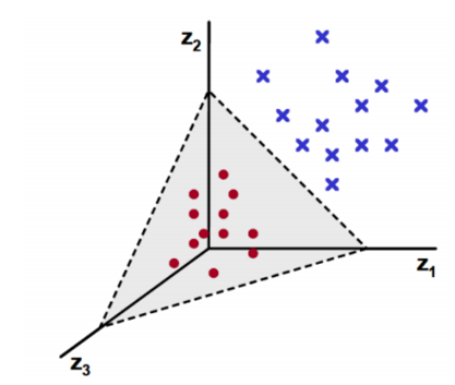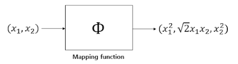 2차 원상 데이터를 다음과 같은 매핑 함수를 이용해 3차원 공간으로 뿌려줄 수 있다. 그러면 다음과 같이 새로운 축을 기반으로 데이터를 분류하는 초평면을 찾을 수 있다.