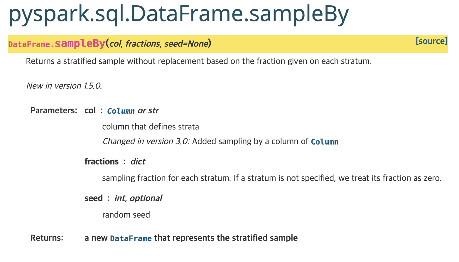 sampleBy는 sample과 다르게 col을 지정하고 col value에 따라 층화 랜덤 추출을 한다.