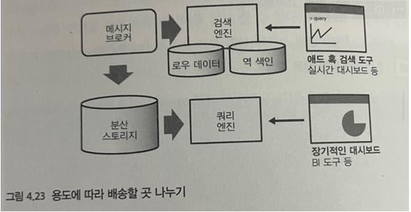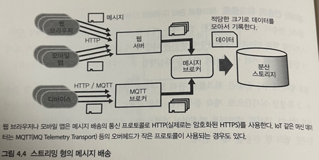 - 푸쉬형 메시지 배송은 모두 메시지 브로커에 집중시키고 일정한 빈도로 꺼낸 데이터를 분산 스토리지에 기록