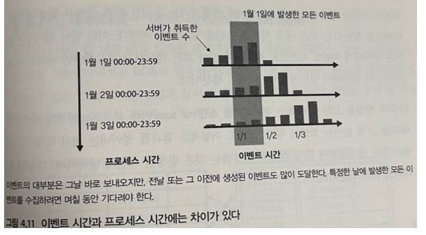- 분산 스토리지에 데이터를 넣는 단계에서는 이벤트 시간이 아니라 프로세스 시간을 사용하는 것이 보통