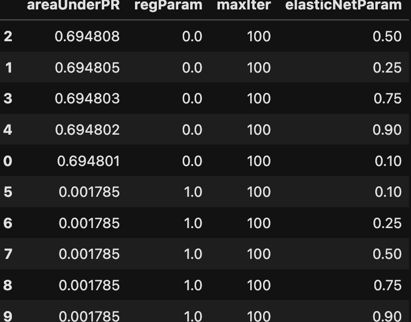 evaluator = BinaryClassificationEvaluator(labelCol = "Class", metricName = "areaUnderPR")