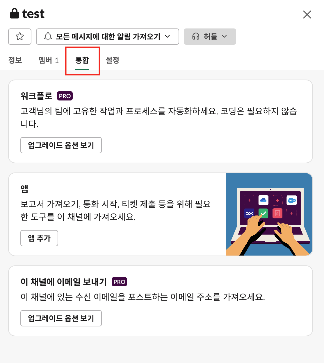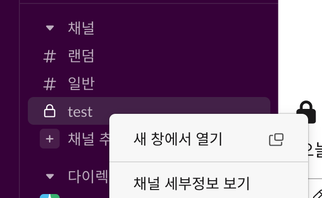 우리가 만든 앱을 채널에 등록하는 단계이다. 우선, 기존에 만들어둔 채널이 있다는 가정하에 우클릭후 '채널의 세부정보 보기' 로 들어간다. 그리고 '통합' 탭에서 '앱 추가'를 진행한다. 검색 기능을 통해 앞서 2-1 단계에서 만든 'test'라고 만든 앱을 채널에 추가한다.