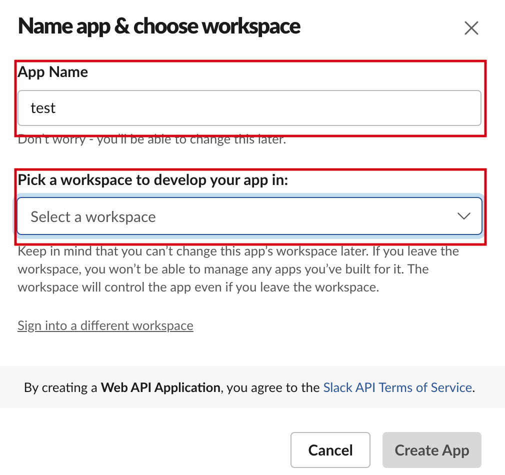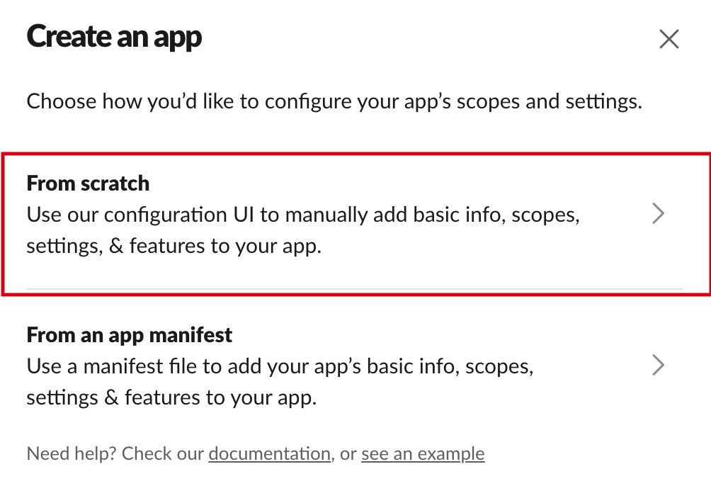 create app을 클릭하고 나면 아래와 같은 페이지가 나온다. 해당 페이지에서 'From Scratch'를 클릭한다. 그러면 app의 이름과 해당 app을 이용할 slack workspace를 선택한다.