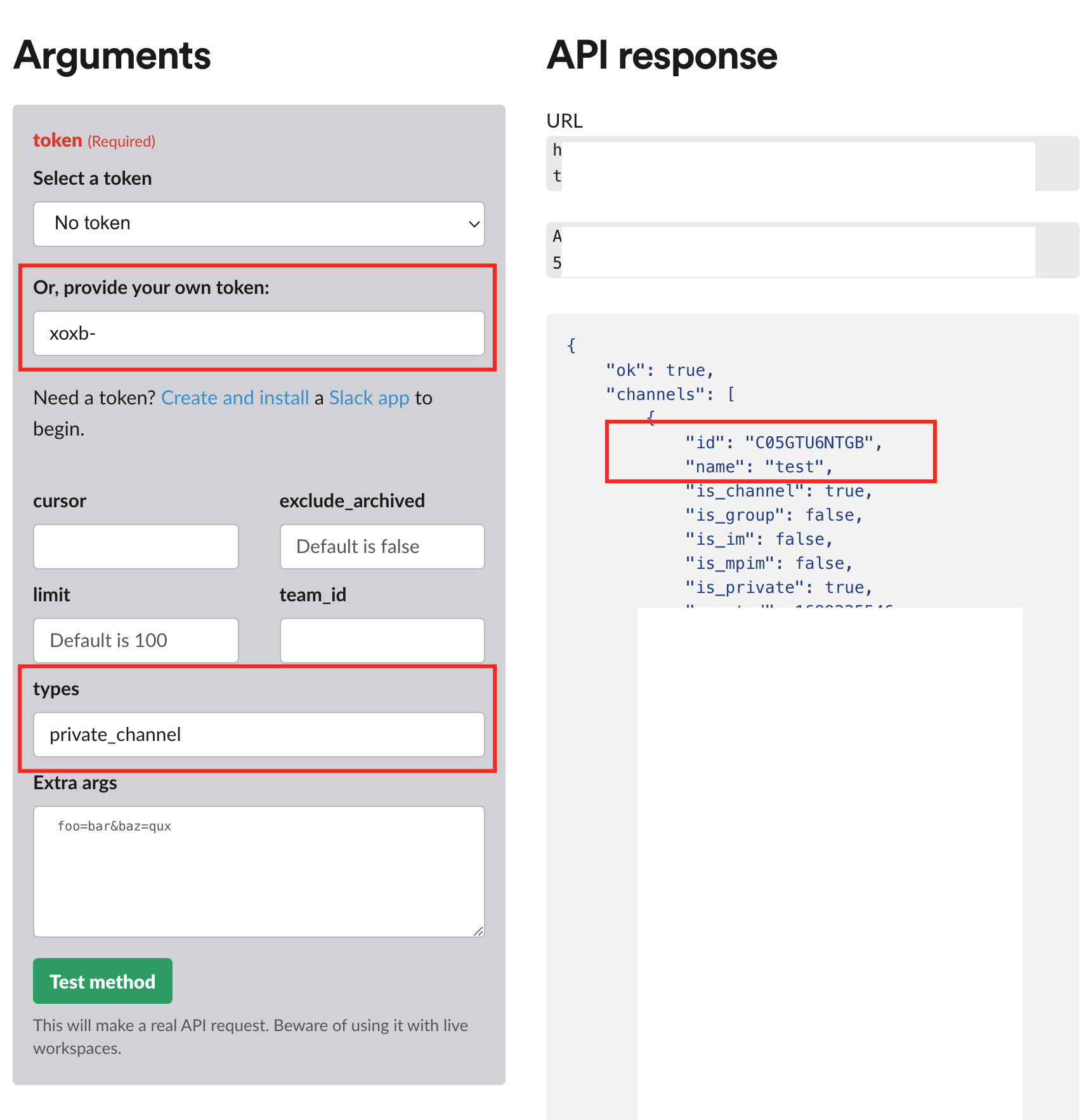 참고로 공유 채널이 아니라 pivate 채널인 경우에는 앞서 scope 설정시 group:read를 설정해주고 type에 private_channel을 적어준다.