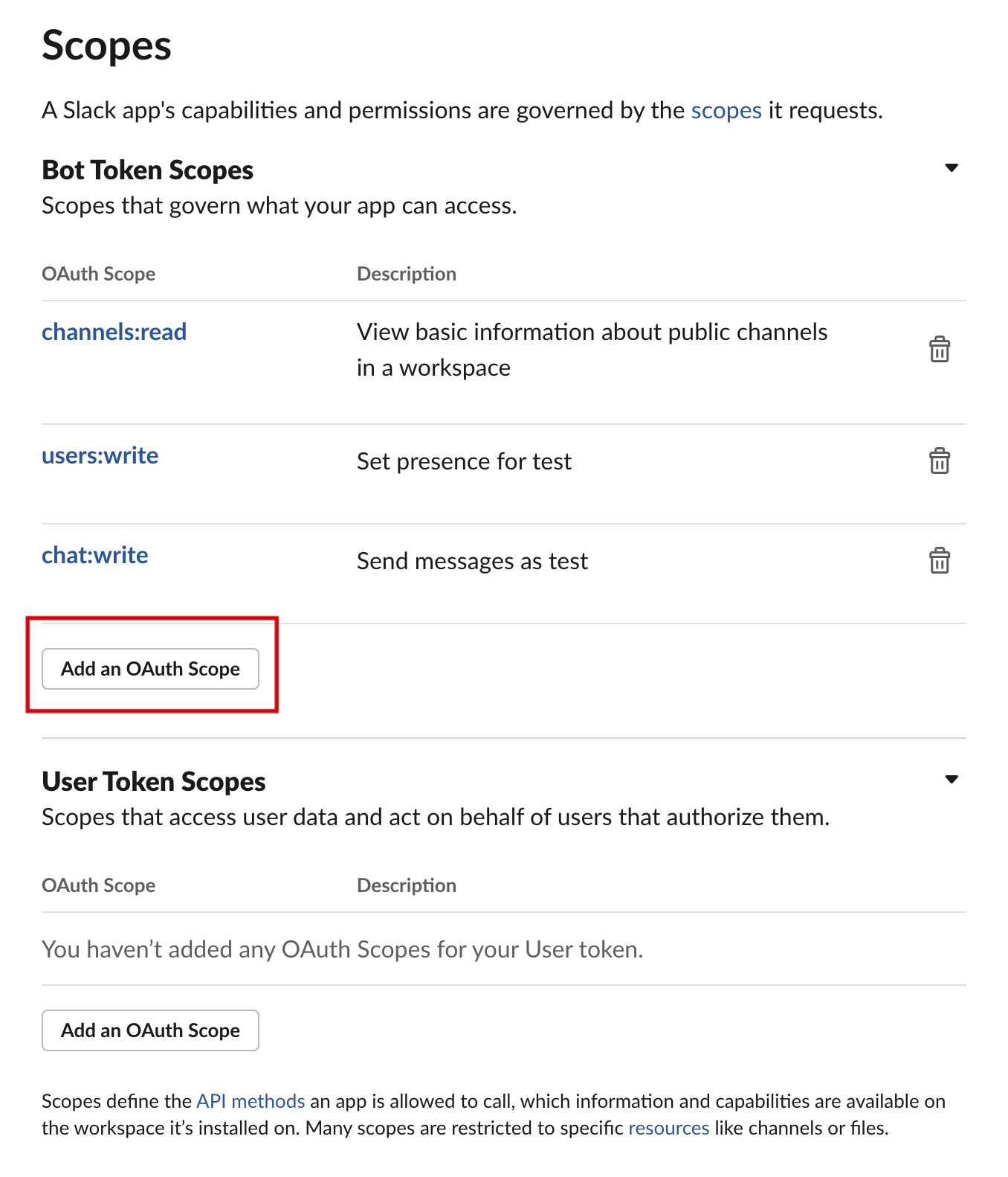 The capabilities and permissions of Slack apps are governed by named scopes.