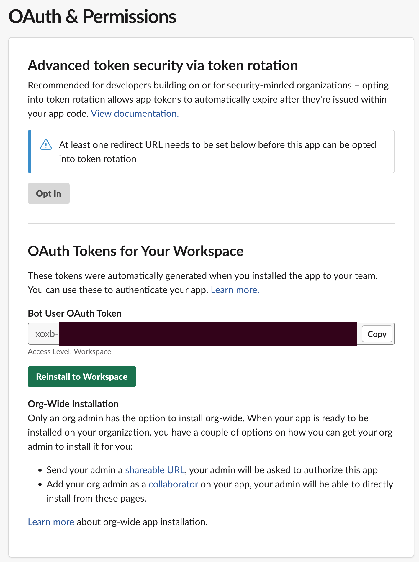 해당 scope 설정을 하고 'install to Workspace' 를 클릭하면 OAuth Tokens을 발급 받을 수 있다. 이 Token은 일종의 인증 key로 우리가 만든 채널에 app이 접근할 수 있도록 한다.