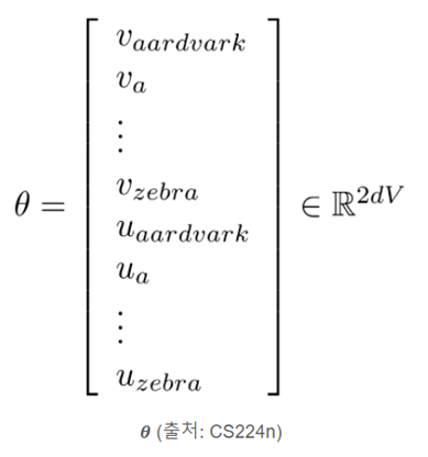 목적함수를 최소화 하는 모델의 파라미터 $\theta$. 즉 단어를 나타내는 두 벡터 $u$, $v$를 찾게 되는데 V개의 단어가 존재하고 우리가 찾는 모수 $\theta$가 d 차원 벡터(d-dimension vector) 일 때, word vector는 2dV 차원을 갖는다.