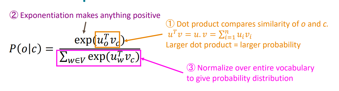 $$ P(o|c) = \frac{exp(u^{T}_{o}v_{c})}{\sum_{w \in V}exp(u^{T}_{w}v_{c})}$$