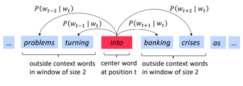 위의 예에서 'into'라는 중심단어(center word)가 주어졌을 때 주변 맥락단어(context word)와 유사도 계산을 한다. 즉, 'into' 라는 단어가 주어졌을 때 'banking', 'turning' 등.. 이 나타날 확률을 계산하고 확률값이 최대가 될 때까지 계산을 하게 된다.